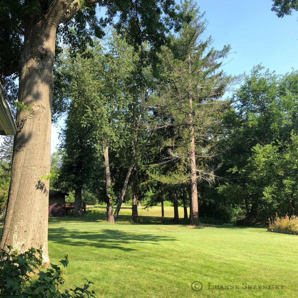 Here’s my photo from this morning. I’m visiting my brother in Ohio for the holiday weekend. He has a large property with a small lake and lots of….you guessed it…trees!